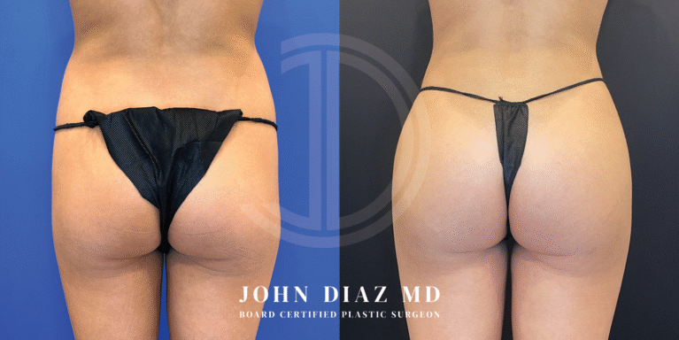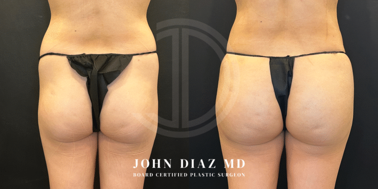 Recovery typically takes several weeks, with most patients returning to light activities in 10–14 days. You’ll need to avoid sitting or lying directly on your buttocks for at least two weeks. A compression garment is worn to reduce swelling and support your new shape. Full results appear gradually over 3–6 months as the fat settles and swelling resolves. Dr. Diaz provides a tailored recovery plan to ensure comfort, safety, and beautiful long-term results.